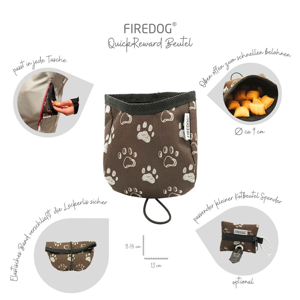 Der FIREDOG QuickReward Beutel ist die ideale Lösung für alle Hundehalter und Trainer, die sauber, organisiert und für schnelle Belohnungen bereit sein möchten – ohne sperrige Leckerli-Tasche.