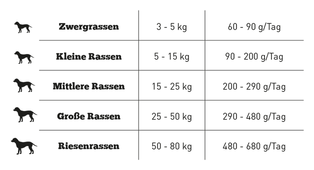 Die richtige Futtermenge lässt sich am besten über eine regelmäßige Gewichtskontrolle des Hundes ermitteln. Der Vergleich des individuellen Gewichtsverlaufes mit der rassetypischen Wachstumskurve wird empfohlen. Frisches Trinkwasser sollte immer zur freien Verfügung stehen.